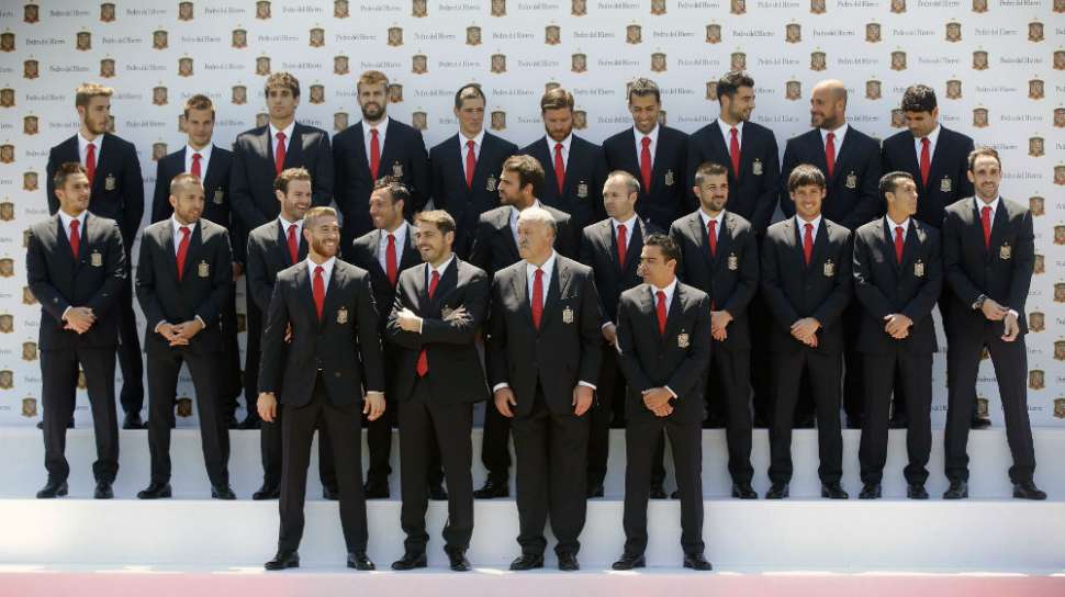 Belakang : Sergio Ramos (Real Madrid), Gerard Pique (Barcelona), Raul Albiol (Napoli), Cesar Azpilicueta (Chelsea), Juanfran (Atletico Madrid), Jordi Alba (Barcelona)