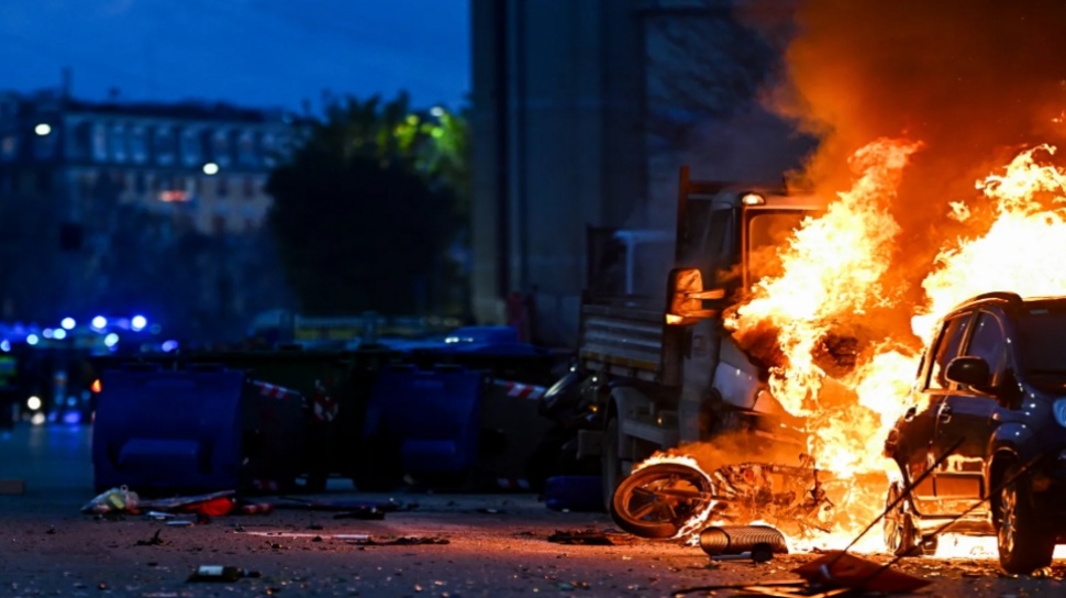 - Bentrokan mengakibatkan pembakaran kendaraan, termasuk mobil serta van, memaksa polisi menggunakan gas air mata.