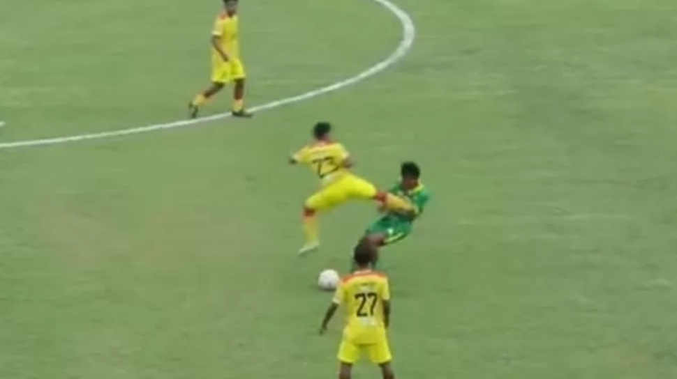 Alih-alih berusaha memenangkan perebutan bola secara sportif, Hilmi justru melepaskan tendangan yang menyerupai aksi bela diri.
