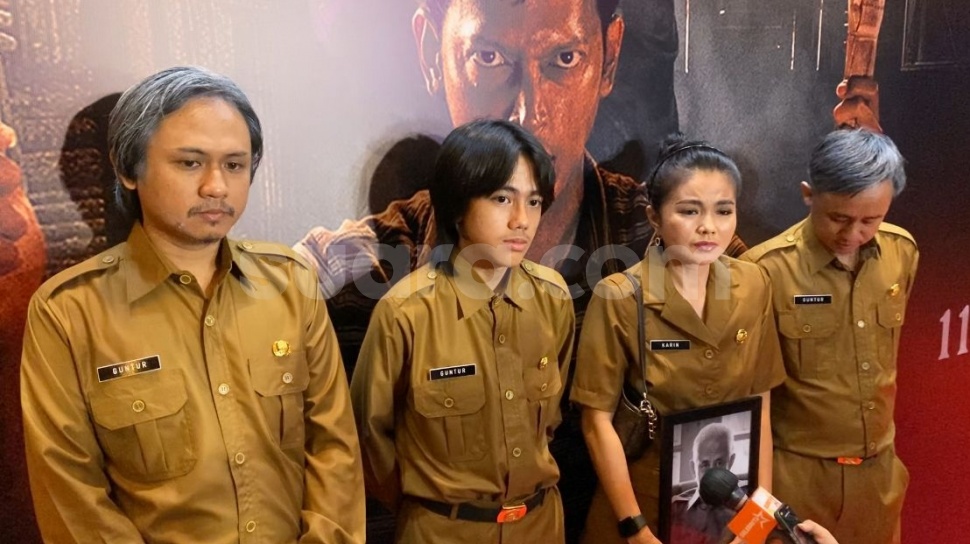 Mata sembab tak bisa disembunyikan dari wajah keduanya. Karina hadir mengenakan kostum seragam asli yang dipakai Epy dalam film tersebut sambil mendekap foto almarhum.
