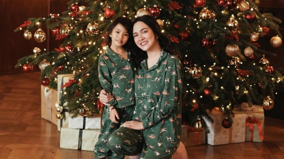 Dengan mengenakan piyama bermotif dan berwarna senada dengan sang anak, Shandy Auia tampak berfoto di depan pohon Natal yang sudah dihias.