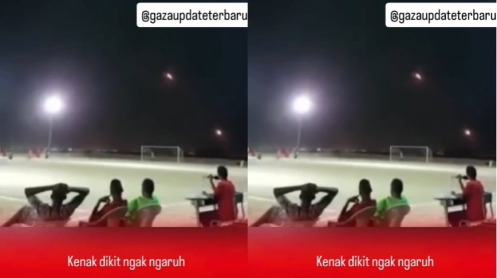 "Momen santuy warga Iraq main bola sambil lihat rudal negara tetangganya Iran dan Israel mondar-mandir," keterangan dalam video tersebut.