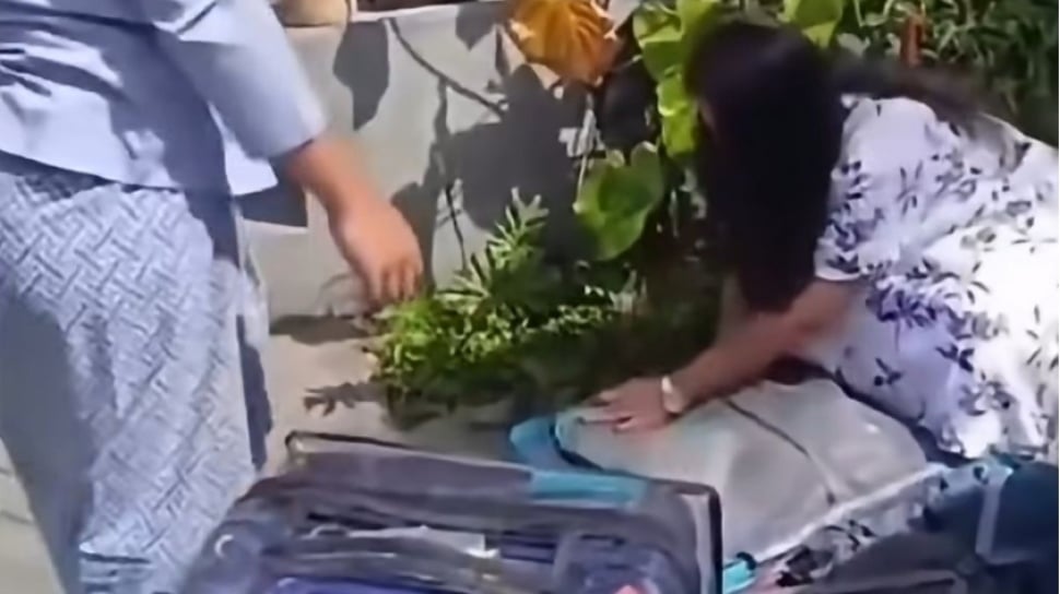 Dalam rekaman yang beredar, terlihat dua perempuan tengah membuka koper di area parkir, tepat di samping sebuah mobil putih.