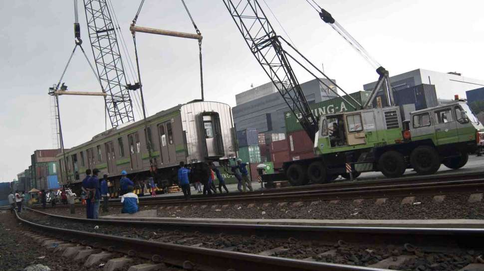 Suara.com - Pekerja menggunakan alat berat menurunkan sebuah unit gerbong KRL di Stasiun Pasoso, Jakarta, Jumat (3/12). PT KAI Commuter Jabodetabek mendatangkan 16 unit gerbong KRL seri JR 205 dari Jepang yang merupakan bagian terakhir dari program pengadaan KRL untuk tahun 2014. [Antara/Vitalis Yogi Trisna]