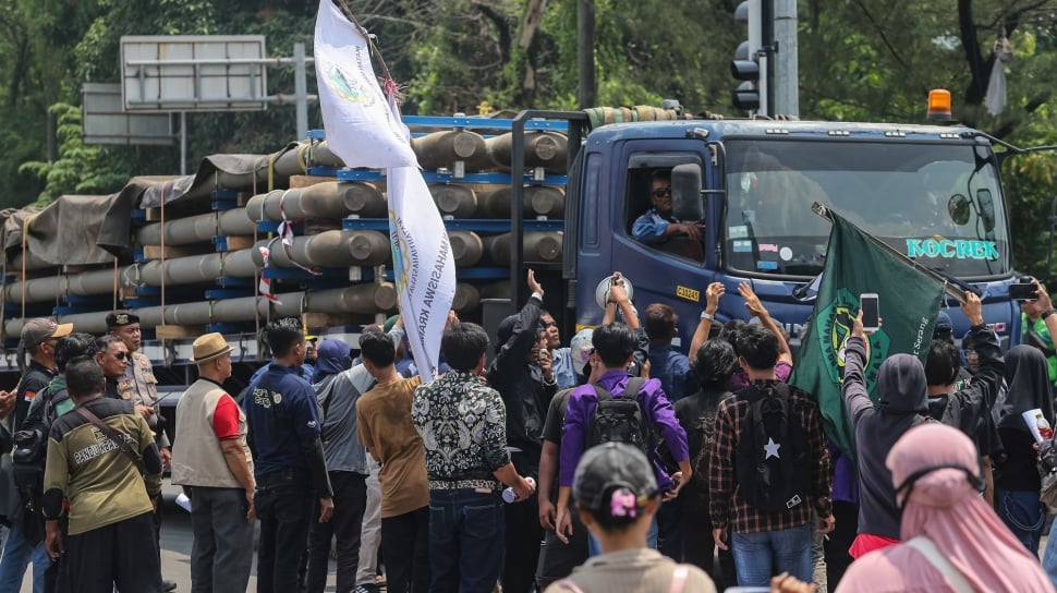 Suara.com - Pengunjuk rasa meminta sopir truk untuk berputar arah saat berlangsungnya aksi menuntut penertiban truk berdimensi dan bermuatan lebih atau overdimension-overload (ODOL) di Jalan Lingkar Selatan, Kota Cilegon, Banten, Kamis (16/10/2025).