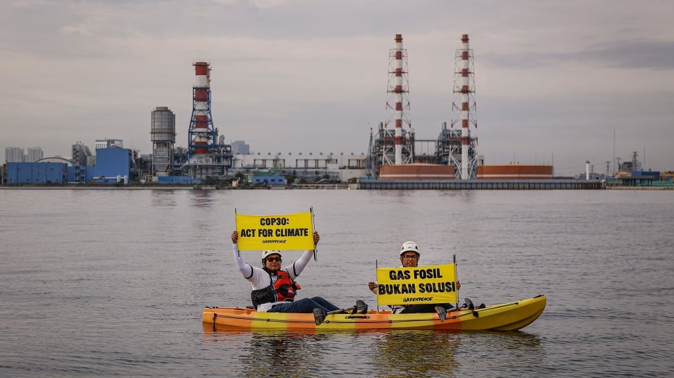 Greenpeace Indonesia menyebut penggunaan gas fosil secara berkelanjutan akan membawa kerugian ekonomi, sosial, dan lingkungan yang signifikan dalam jangka panjang. Mereka mendesak percepatan investasi energi terbarukan seperti tenaga surya dan angin. Aksi ini bertepatan dengan berlangsungnya Konferensi Perubahan Iklim PBB COP30 di Belem, Brasil. [ANTARA FOTO/Dhemas Reviyanto/YU]