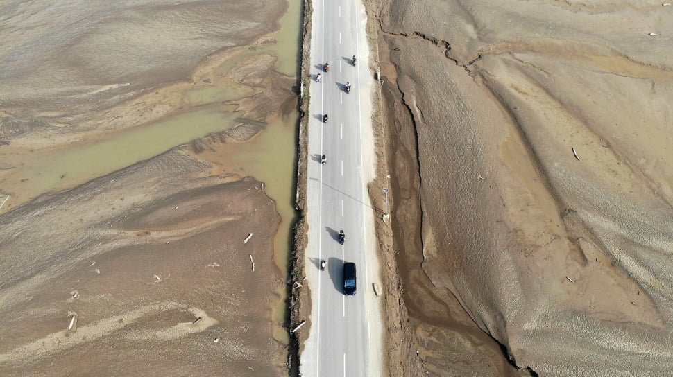 Suara.com - Kendaraan melintas di jalan yang berada di antara lahan pertanian yang rusak akibat terendam banjir dan lumpur banjir bandang di Pidie Jaya, Aceh, Senin (8/12/2025).