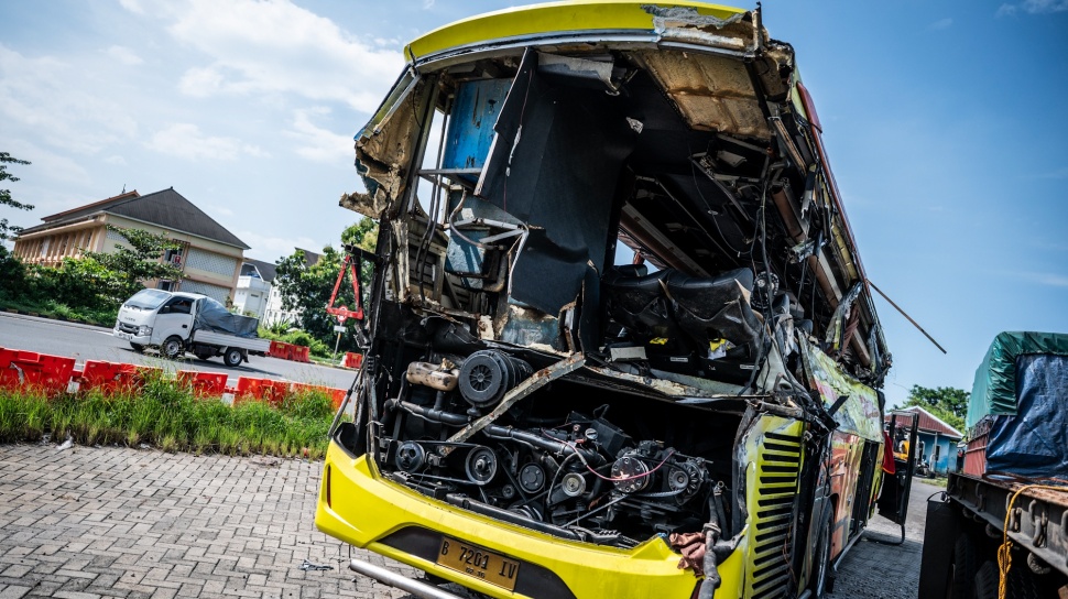 Suara.com - Kondisi bangkai bus PO Cahaya Trans bernomor polisi B 7201 IV pascakecelakaan terparkir di kawasan Gerbang Tol Muktiharjo, Semarang, Jawa Tengah, Senin (22/12/2025).