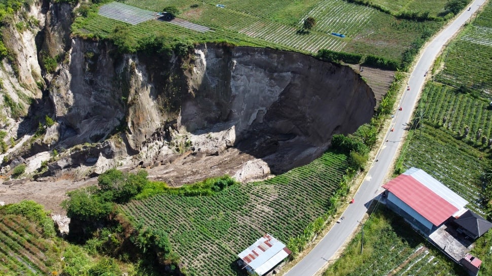 Suara.com - Foto udara suasana perkebunan milik warga yang amblas di jalan lintas Kecamatan Desa Pondok Balik, Kecamatan Ketol, Aceh Tengah, Aceh, Selasa (14/1/2026). Fenonema tanah amblas tersebut berada di pinggir jalan lintas penghubung Kabupaten Aceh Tengah dan Kabupaten Bener Meriah.