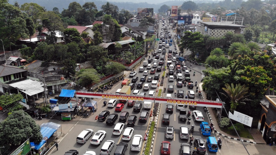 Suara.com - Foto udara kepadatan kendaraan saat pemberlakuan rekayasa lalu lintas sistem satu arah (one way) menuju kawasan wisata Puncak, Gadog, Kabupaten Bogor, Jawa Barat, Senin (16/2/2026).