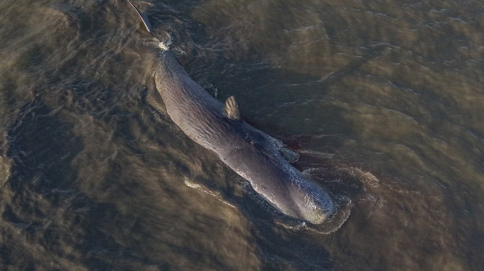 Warga yang melihat bangkai paus ini tampak merekam dan mengunggah ke media sosial, membuat penemuan hewan laut berukuran besar itu viral dan mengundang perhatian luasm