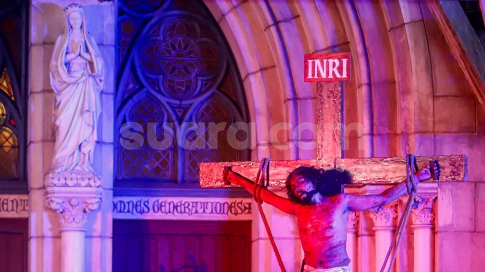 Suara.com - Umat Katolik memerankan visualisasi Jalan Salib saat peringatan Jumat Agung di Gereja Katedral, Jakarta, Jumat (3/4/2026). Jalan Salib tersebut merupakan rangkaian ibadah Jumat Agung dalam memperingati wafatnya Yesus Kristus.