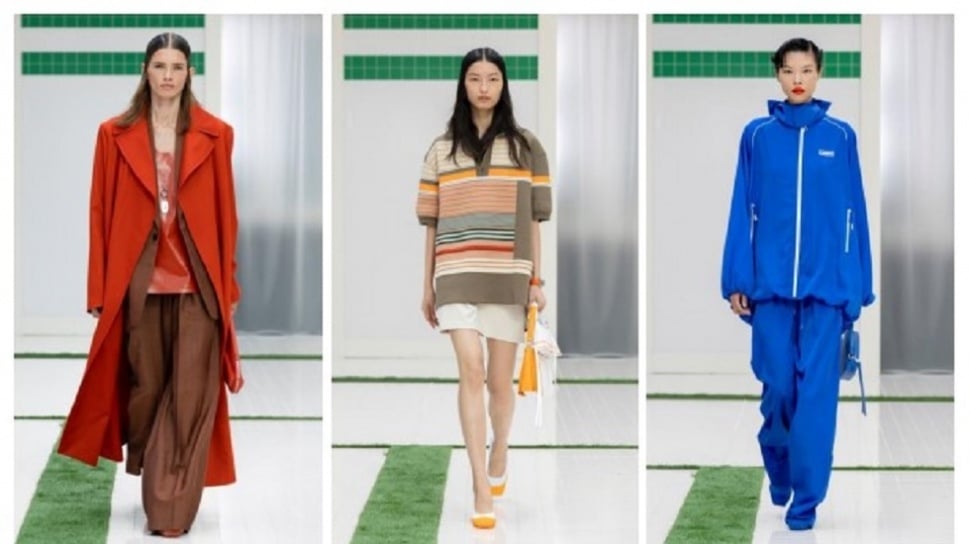 Koleksi Lacoste menampilkan versi reinterpretasi polo tenis klasik, kali ini oversized dan transparan, celana vintage longgar, serta trench coat bergaya jubah dengan tulisan “Tennis for Everyone”.