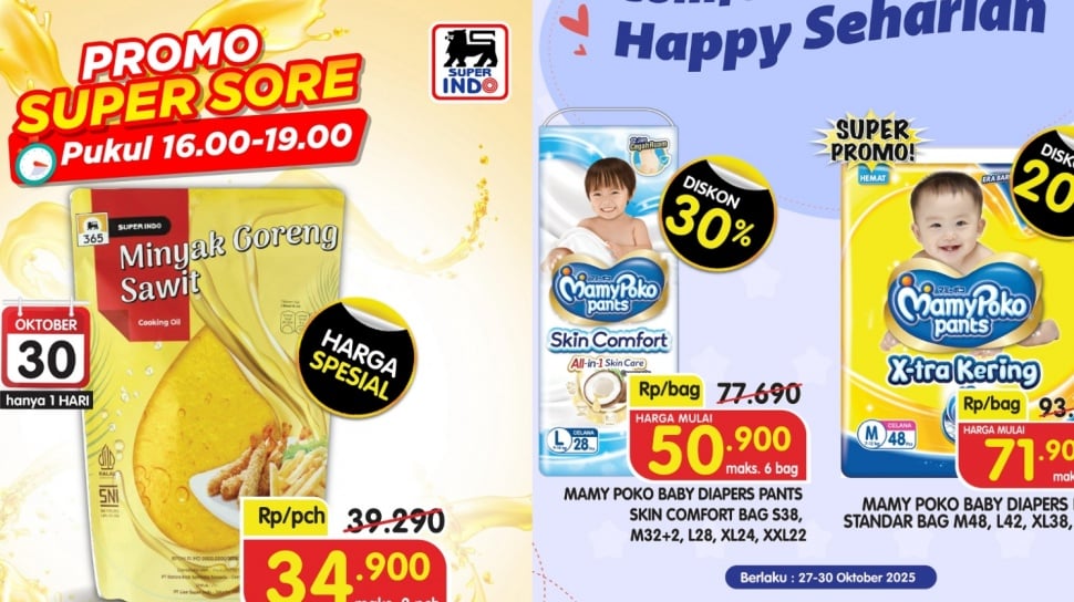 - Promo Superindo 30 Oktober - 5 November 2025 untuk belanja hemat dengan diskon hingga 45% untuk kebutuhan pokok seperti minyak goreng dan beras.