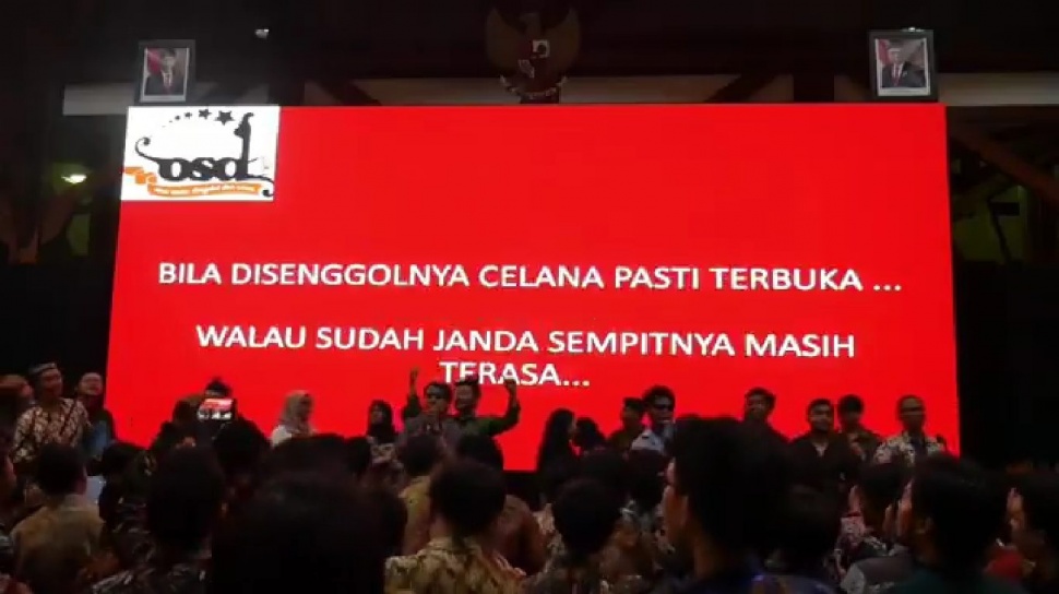 Dalam video yang diunggah oleh akun @iPoopBased pada 13 April 2026, tampak puluhan mahasiswa bernyanyi dengan antusias, sementara lirik lagu diproyeksikan secara jelas di layar panggung.