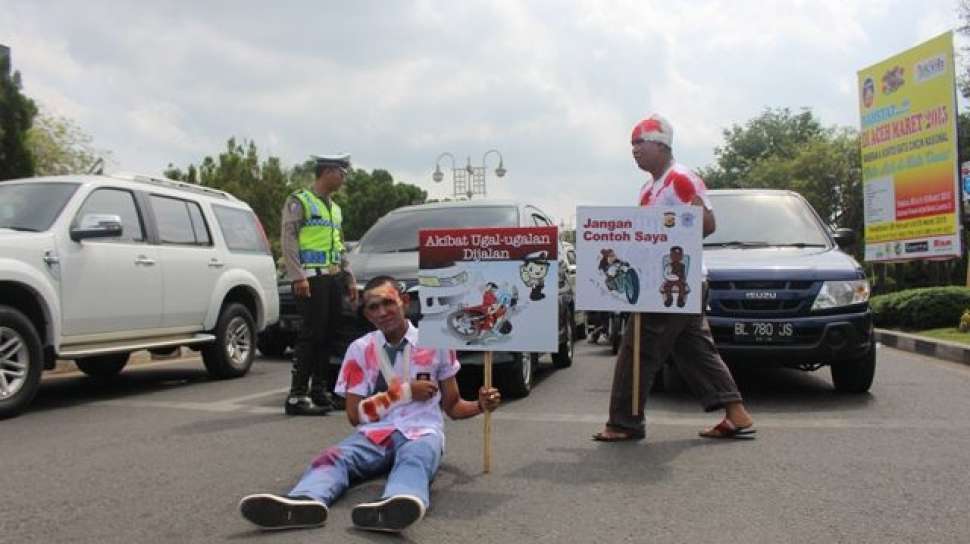 Suara.com - Satuan Polisi Lalu lintas Kepolisian Resor Kota Banda Aceh menyelenggarakan Operasi Simpatik Rencong, Rabu (8/4/2015). Operasi kali ini digelar dengan cara unik. Mereka membawa sejumlah orang yang didandani seperti korban kecelakaan ke Bundaran Simpang Lima, Banda Aceh, untuk memberi pesan kepada para pengendara.
