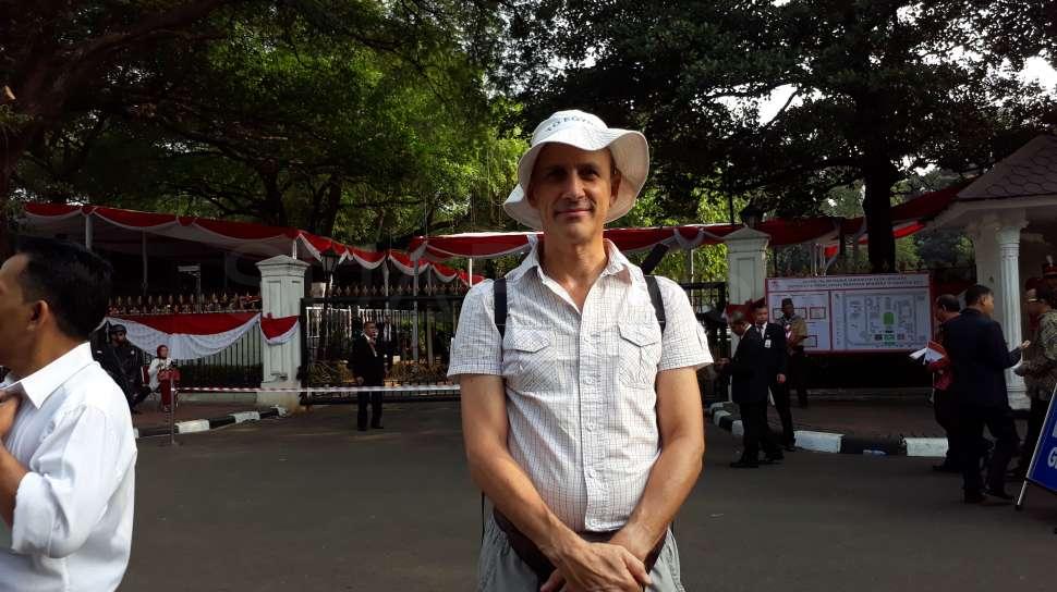 Turis asal Italia, Luca (57), di antara ribuan warga yang memadati kawasan depan Istana Merdeka, Jalan Medan Merdeka Utara, Jakarta, Kamis (17/8/2017), untuk menyaksikan peringatan HUT RI.