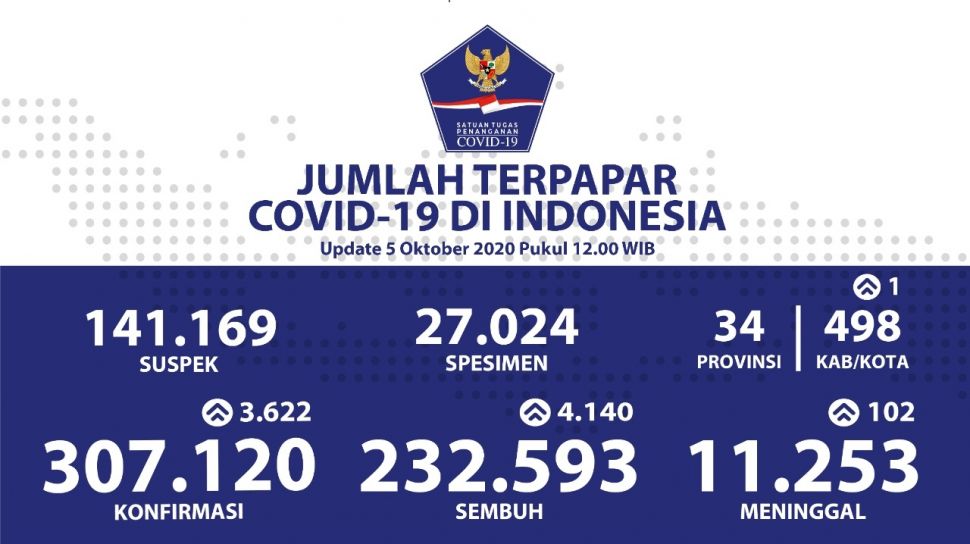 Suara.com - Pasien terkonfirmasi positif covid-19 di Indonesia pada Senin (5/10/2020) per pukul 12.00 WIB selama 24 jam kembali bertambah sebanyak 3.622 orang.