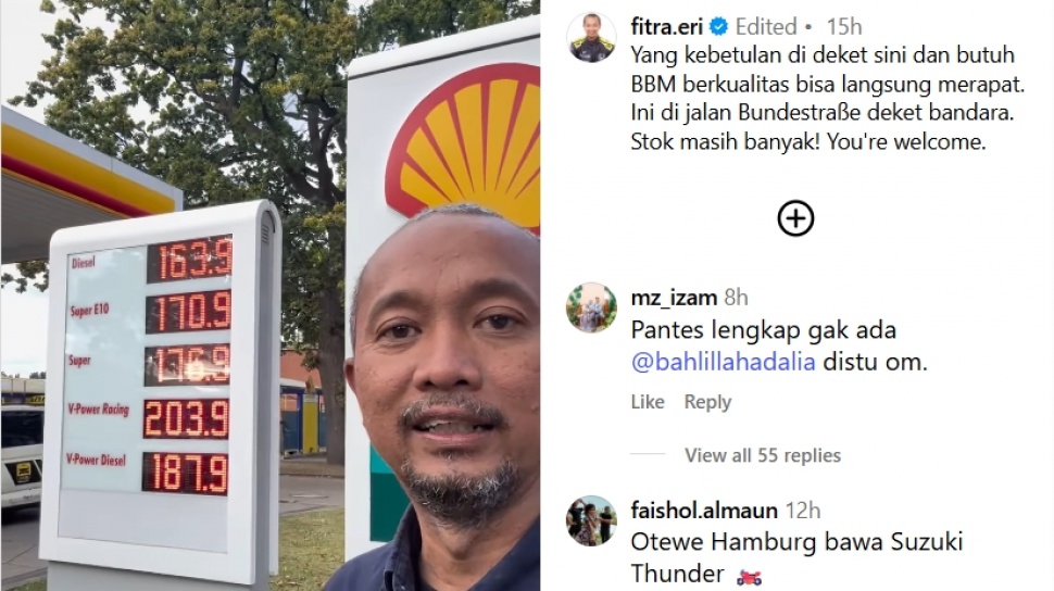 "Yang kebetulan di deket sini dan butuh BBM berkualitas bisa langsung merapat. Ini di jalan Bundestraße deket bandara. Stok masih banyak! You're welcome," tulis Fitra dalam postingan video tersebut.