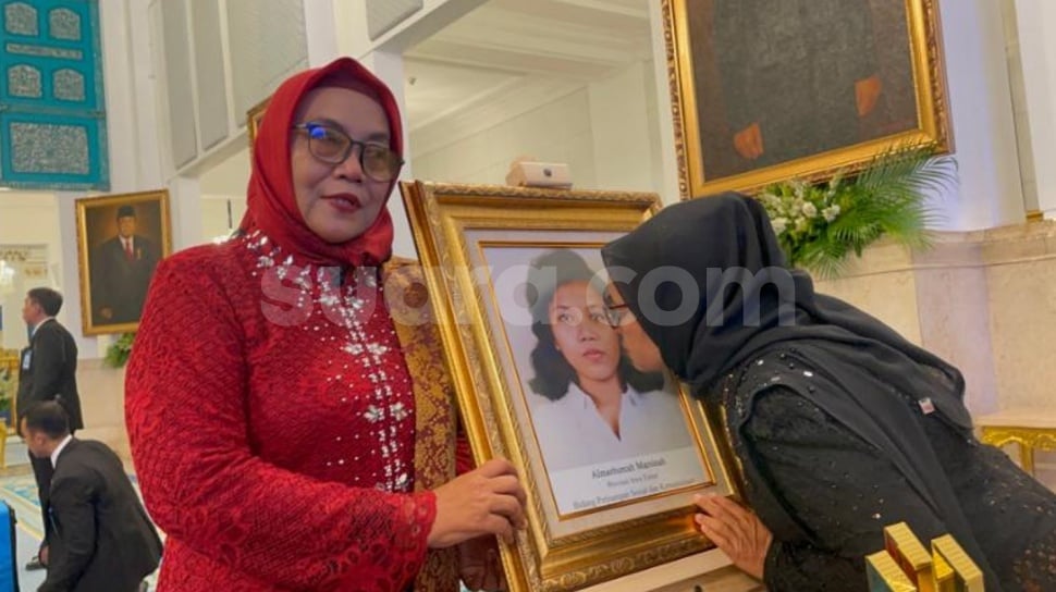 Suara.com - Tangis adik Marsinah, Wijiati pecah. Ia tak kuasa menahan haru usai menjadi perwakilan keluarga menerima anugerah gelar pahlawan nasional untuk kakaknya.