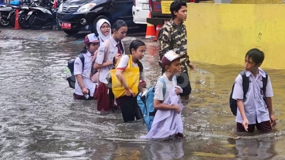 Tak hanya itu, banyak juga anak sekolah yang menerobos banjir dengan mencopot sepatu hingga celana.