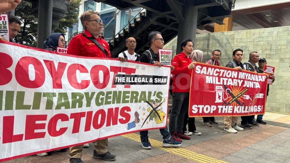 Suara.com - Serikat Pekerja dan Organisasi Masyarakat Sipil Asean menggelar aksi solidaritas kepada warga Myanmar di depan Hotel Le Meredien, Jakarta.