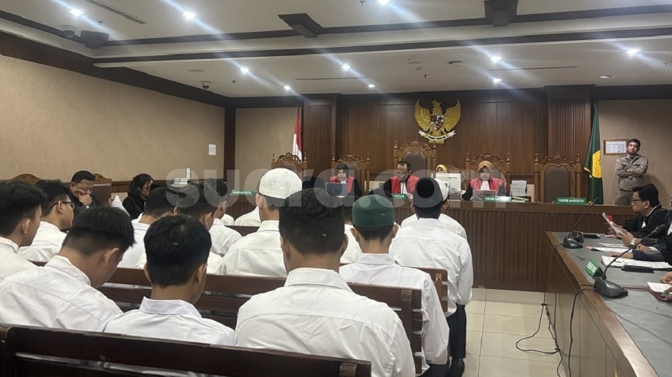 Para terdakwa, yang mayoritas mengenakan kemeja putih, harus menghadapi pasal berlapis yang tidak main-main.