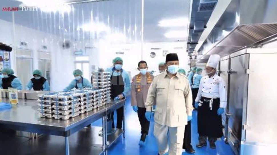 Prabowo melihat langsung proses pengolahan makanan hingga pemorsian menu makan bergizi gratis (MBG) di ompreng, sebelum dikirim kepada penerima manfaat.
