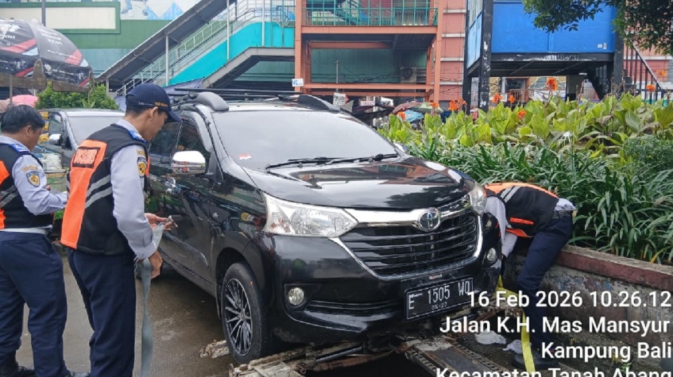 - Aparat gabungan menertibkan kendaraan parkir liar di Pasar Tanah Abang, Jakarta Pusat pada Senin, 16 Februari 2026.