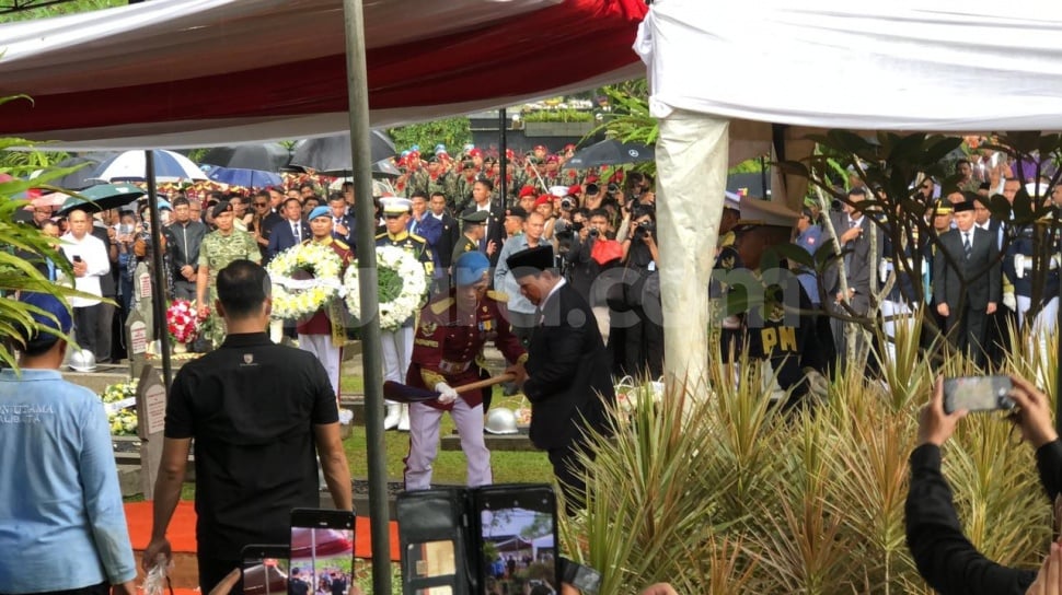 Tampak Prabowo dan Gibran yang berjalan mengiringi jenazah almarhum menuju liang lahat. Prabowo selanjutnya memimpin upacara pemakaman didampingi Gibran.