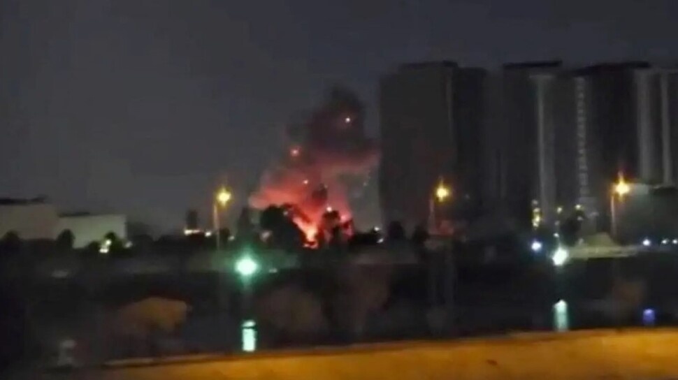 Kepulan asap dan reruntuhan terlihat saat sistem pertahanan udara bekerja menghentikan serangan.
