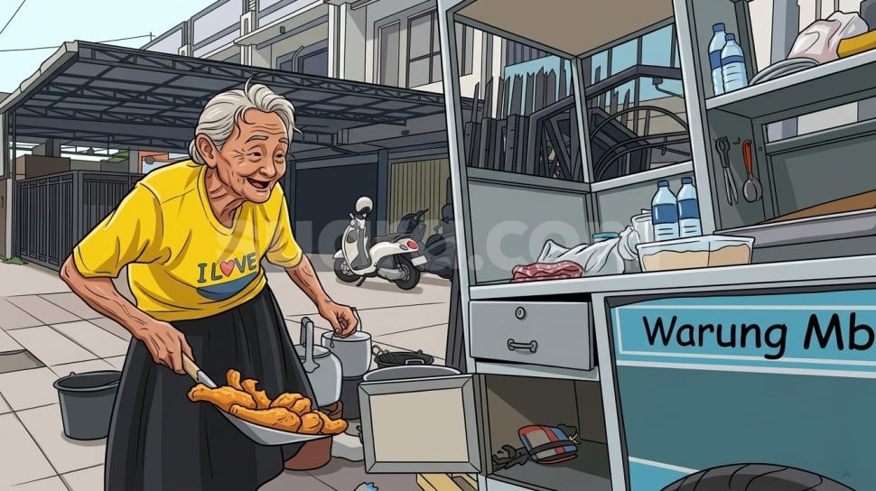 Warung kecil itu berdiri nyaris menyatu dengan trotoar. Sebuah gerobak sederhana berlapis kaca menjadi etalase sekaligus dapur, dengan tulisan 'Warung Mbah Tiwi' yang mulai pudar dimakan waktu.