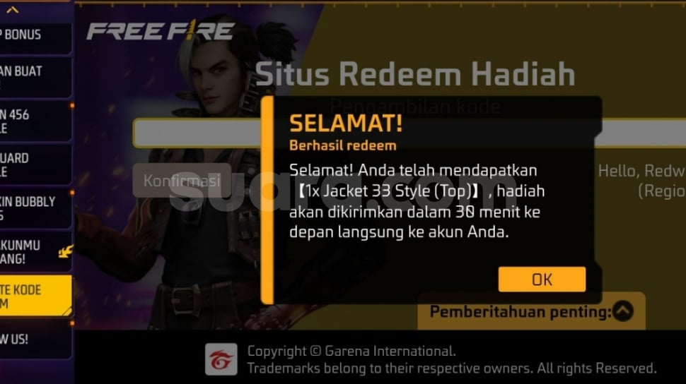 5. Jika berhasil, hadiah akan langsung meluncur ke in-game mail di akun Free Fire kamu.
