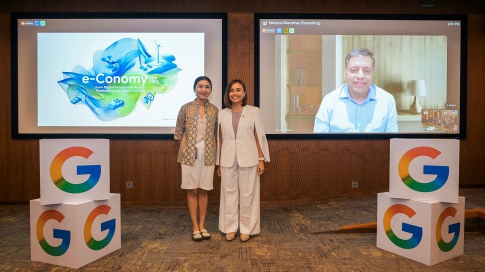 Ki-Ka : Felicia Wienathan, Communications Manager, Google Indonesia; Veronica Utami, Country Director, Google Indonesia; (di layar) Aadarsh Baijal, Partner, Bain & Company dalam jumpa pers laporan SEA e-Conomy 2025 yang dirilis Google, Temasek, dan Bain & Company di Jakarta, Kamis (13/11/2025). [Google Indonesia]